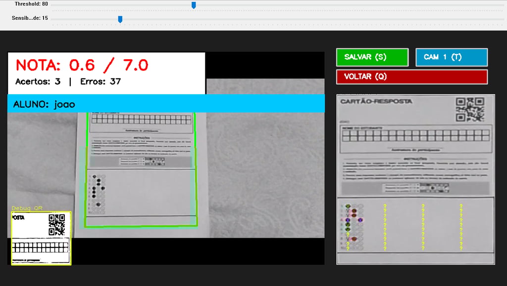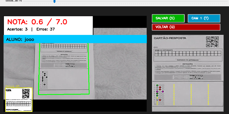 Corrija gabaritos em segundos com a webcam ou fotos no seu computador, salva automaticamente com o nome do aluno.